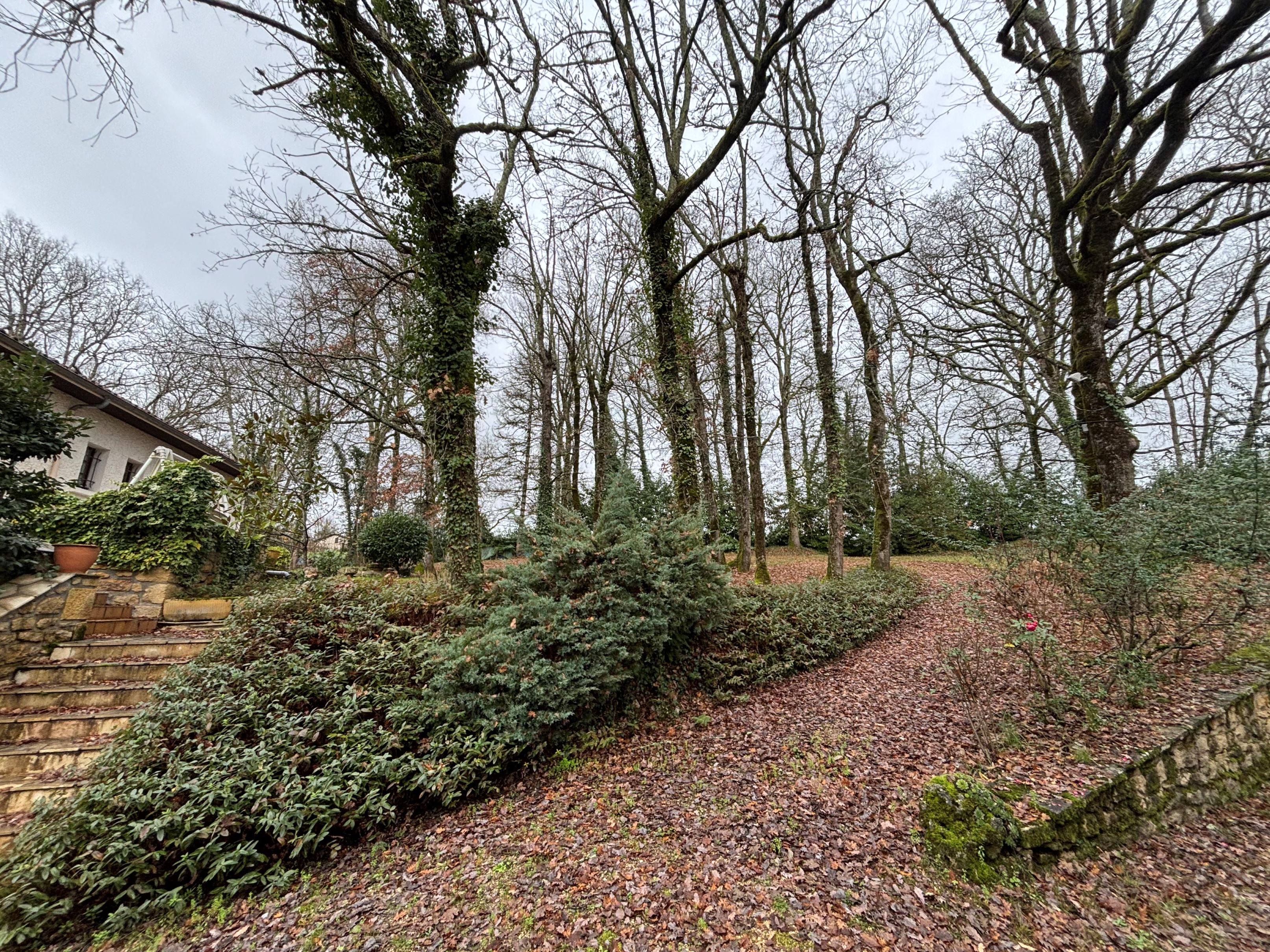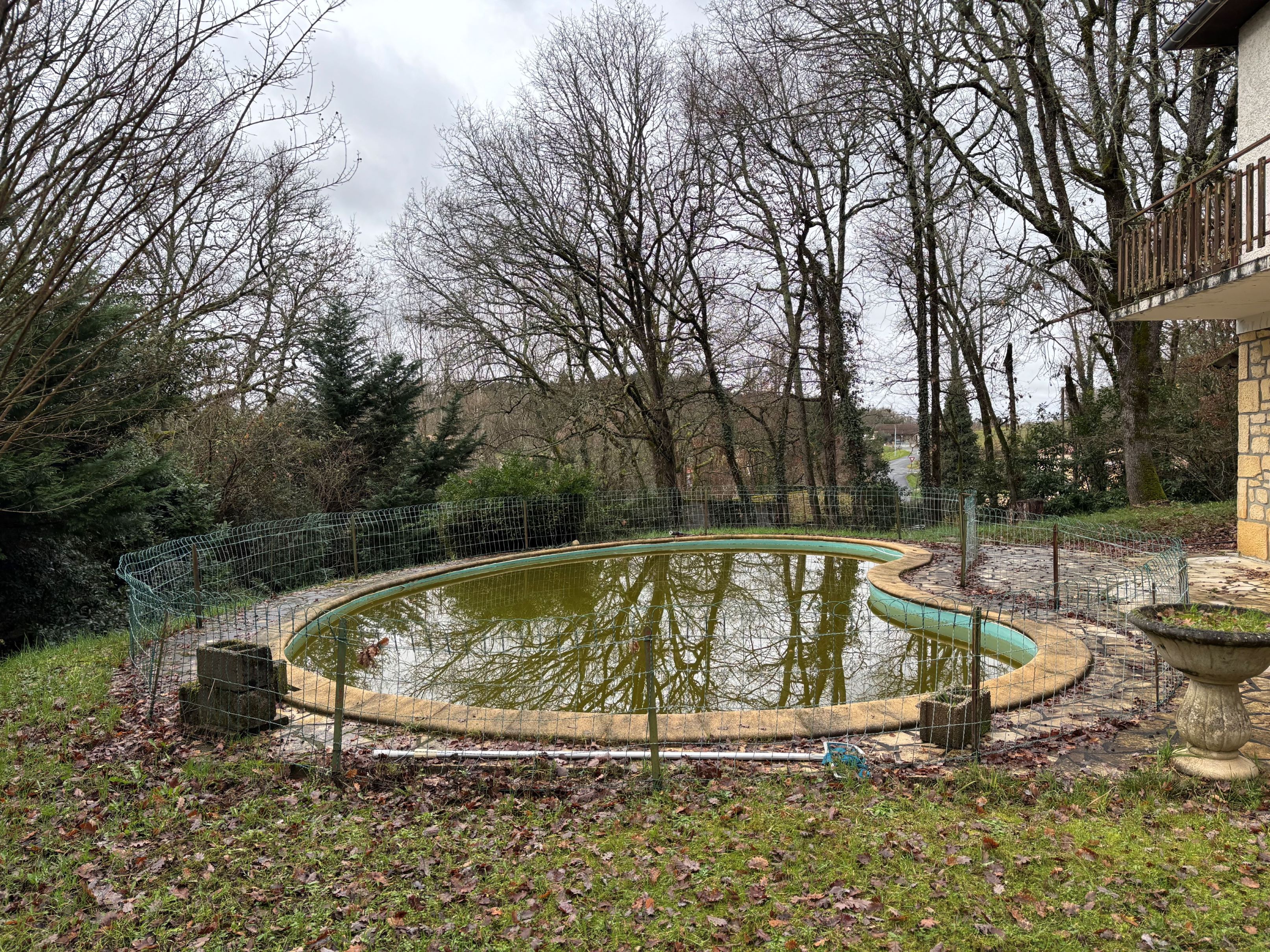 The enclosed, landscaped garden with outbuildings includes a unique swimming pool in need of renovation.
