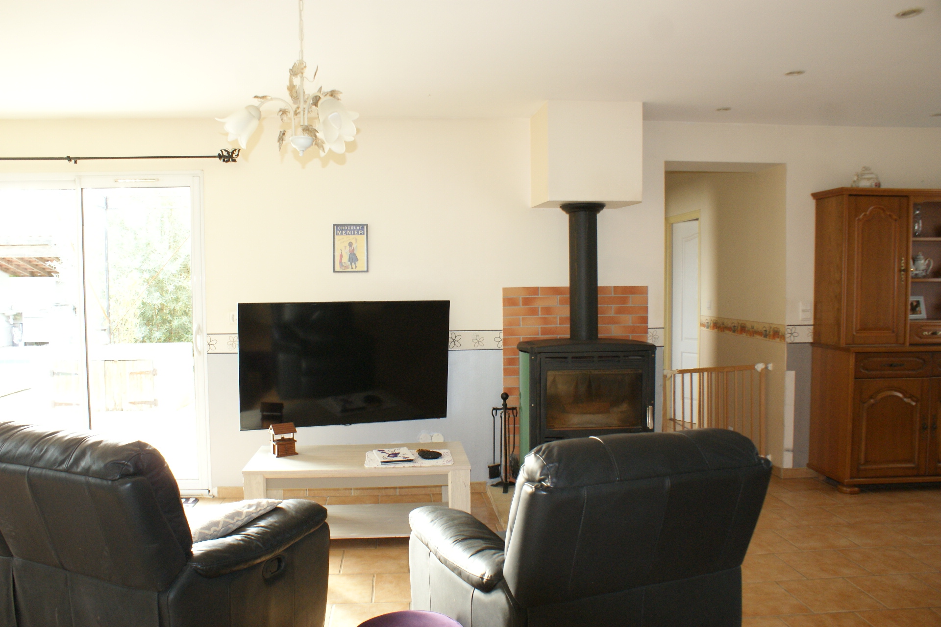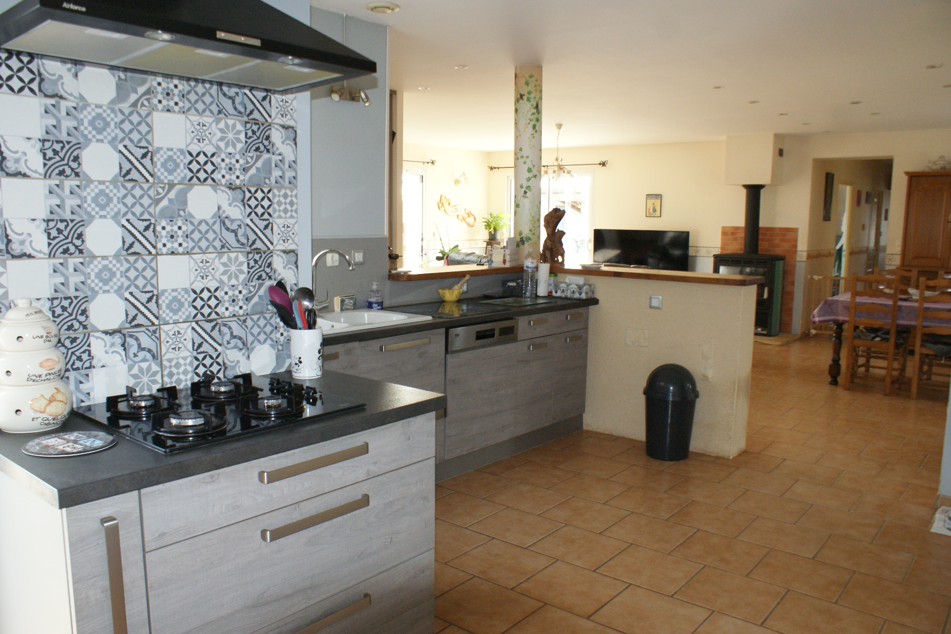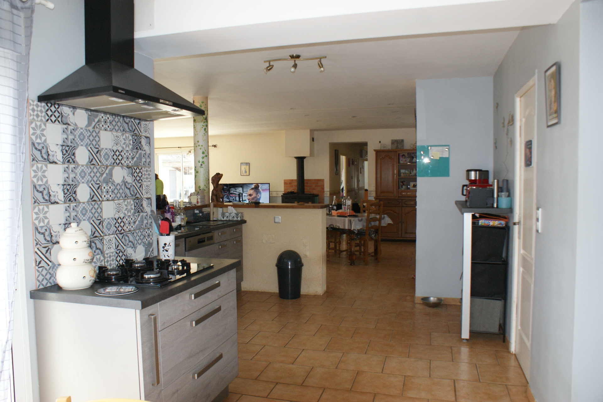 Maison de plain-pied de 138 m² habitables comprenant un séjour avec poêle à bois, une cuisine ouverte, un dégagement, une salle d'eau, un wc, 3 chambres dont une avec dressing, une véranda et une buanderie.
